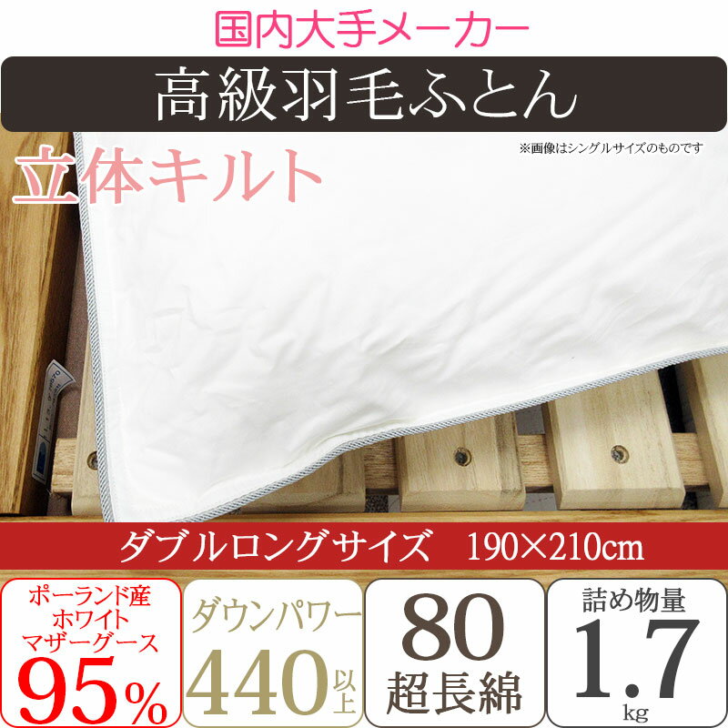 商品詳細 ◆商品お問合せ番号:uk1020-PM95DL立体 ◆メーカー:サンモト ■サイズ/ダブルサイズ 190×210cm ■詰め物 ・ポーランド産ホワイトマザーグースダウン95% ・フェザー5% ■詰め物重量/1.7kg ■ダウンパワー/440cm3/g以上 ■キルティング/立体キルト 5×5マス ■側生地/綿100%(80超長綿) ■日本製 ※送料無料について 北海道・沖縄・離島・一部地域にお住まいの方は、別途手数料が必要となります。