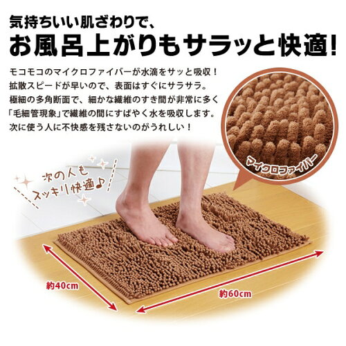 ネットにいれれば洗濯機で丸洗いOK!■商品サイズ:約40×60cm■パッケージサイズ:約ヨコ19×縦32×厚み10cm■生産地:中国■素材・成分:表面:ポリエステル100%、裏面すべり止め:スチレン系エラストマー■パッケージ:個包装商品特徴一覧バスマット、バス、ブラウン、mat、LIGHT、bath、1008207、バス・トイレ備品、生活雑貨 → バス・トイレ・ランドリー → バス用品 → バスマット、4989409082076、通信販売、通販、販売、買う、購入、お店、売っている、ショッピング【マイクロファイバー吸水速乾バスマット ライトブラウン (Chenille Bath Mat Light brown)】広告文責(有)イースクエアTEL:0120-532-772モコモコのマイクロファイバーが水滴をサッと吸収!拡散スピードが早いので、表面はすぐにサラサラ。