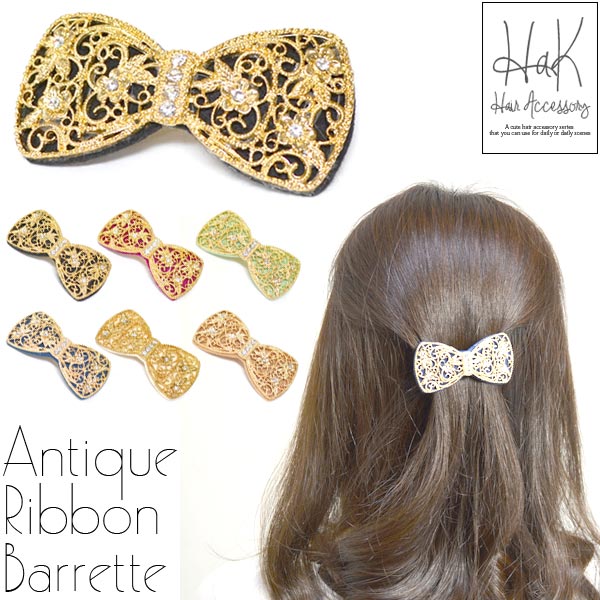 フェルト地ゴールドアンティーク調モチーフ 小粒ラインストーン付きリボン型ヘアバレッタ ヘアクリップ ヘアピンアクセ SSU テラコッタ PRD HAKCOU