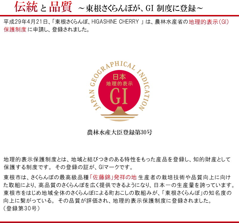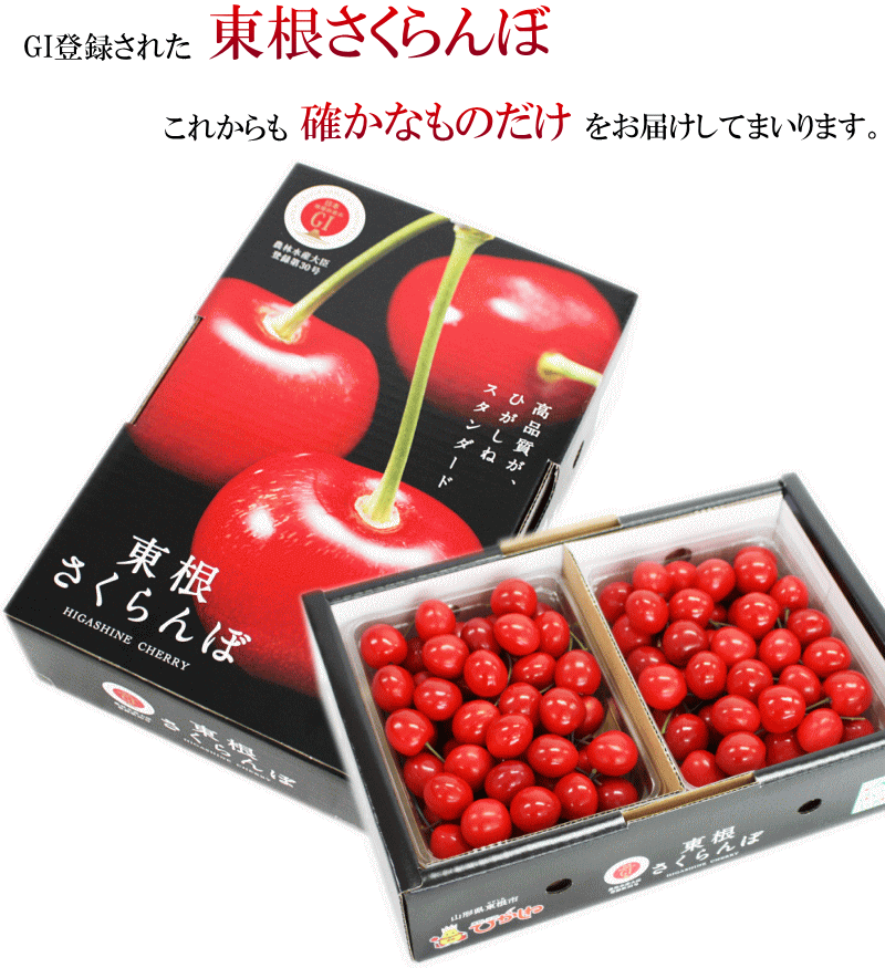 ) 商品説明 平成29年、地理的表示GI保護制度に申請し、日本を代表するブランドとして登録された「東根さくらんぼ」です。